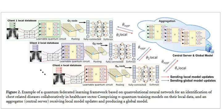 In recent years, the concept of federated machine learning has been actively driven by scientists to ease the privacy concerns of data owners. Currently, the combination of machine learning and quantum computing technologies is a hot industry topic and is positioned to be a major disruptor. It has become an effective new tool for reshaping several industries ranging from healthcare to finance. Data sharing poses a significant hurdle for large-scale machine learning in numerous industries. It is a natural goal to study the advanced quantum computing ecosystem, which will be comprised of heterogeneous federated resources. In this work, the problem of data governance and privacy is handled by developing a quantum federated learning approach, that can be efficiently executed on quantum hardware in the noisy intermediate-scale quantum era. We present the federated hybrid quantum–classical algorithm called a quanvolutional neural network with distributed training on different sites without exchanging data. The hybrid algorithm requires small quantum circuits to produce meaningful features for image classification tasks, which makes it ideal for near-term quantum computing. The primary goal of this work is to evaluate the potential benefits of hybrid quantum–classical and classical-quantum convolutional neural networks on non-independently and non-identically partitioned (Non-IID) and real-world data partitioned datasets among several healthcare institutions/clients. We investigated the performance of a collaborative quanvolutional neural network on two medical machine learning datasets, COVID-19 and MedNIST. Extensive experiments are carried out to validate the robustness and feasibility of the proposed quantum federated learning framework. Our findings demonstrate a decrease of 2%–39% times in necessary communication rounds compared to the federated stochastic gradient descent approach. The hybrid federated framework maintained a high classification testing accuracy and generalizability, even in scenarios where the medical data is unevenly distributed among clients.